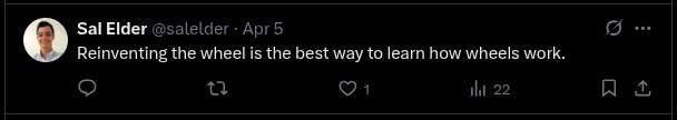 The advice not to reinvent the wheel is dangerous because it sounds so reasonable and responsible. That’s another problem with using ChatGPT to research existing options. It’s calibrated to sound reasonable and responsible, so it’s likely to be another voice telling you not the reinvent the wheel.